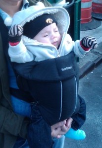 On his daily jaunts around the neighborhood, Nyan doesn’t ride in the stroller that much nowadays, but rather is strapped to Mommy in the Baby Bjorn. He wasn’t enjoying facing her chest, so we’ve turned him around so he can see the world, and he seems to be loving the view. Or maybe he just loves the attention: without fail, Beatrice is stopped by any number of random strangers, oohing and aahing over how cute the boy is. The proud parents eat it all up, of course, and Nyan doesn’t seem to mind either.