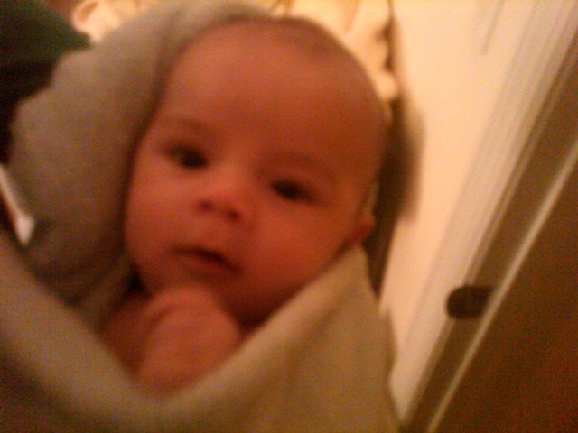 Beyond all that, all is well. Nyan is sleeping through the nights fairly well; he’ll usually have a feed around midnight, then around 4ish, then again around 7 or 7:30, when I’m already up. That’s not bad, though we’re going to try to get him to eat a bit more at midnight in hopes of getting him to sleep the whole night through. He’s typically going to sleep around 8 or 9 these days; some days he fights it for a bit, other days he pretty much passes out soon after bathtime. We’ve added a new twist to bathtime too: every now and then, we’ll fill up the tub as if it’s for an adult… and then either mommy or daddy gets in, followed by Nyan. We make sure he’s perfectly safe, of course, but he LOVES it. He splashes, he waves his arms and legs as if he’s swimming, he smiles, just loves every second of it. Is this a sign that he’ll be a strong swimmer? We hope so. Daddy’s looking forward to teaching him to scuba dive.