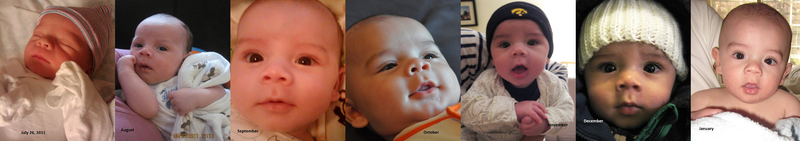 Six months ago today – at 8:27 a.m. on Tues., July 26, 2011 – young Nyan Thomas was born. Wait, what? Six months?! How’d that happen? It’s very much a cliché, yes, but where does the time go… Here’s a series of photographs of the boy through the months, each of them taken at roughly the 26th of each month…