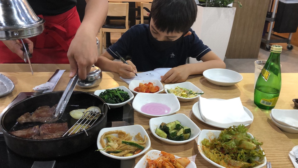 He did some drawing too. Usually he likes to draw fantastical cartoon fantasy worlds, but he’s also got a great eye for still lifes: